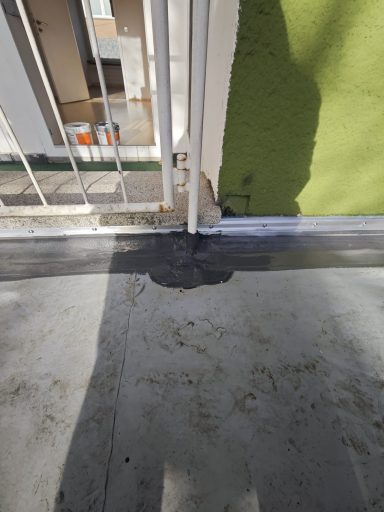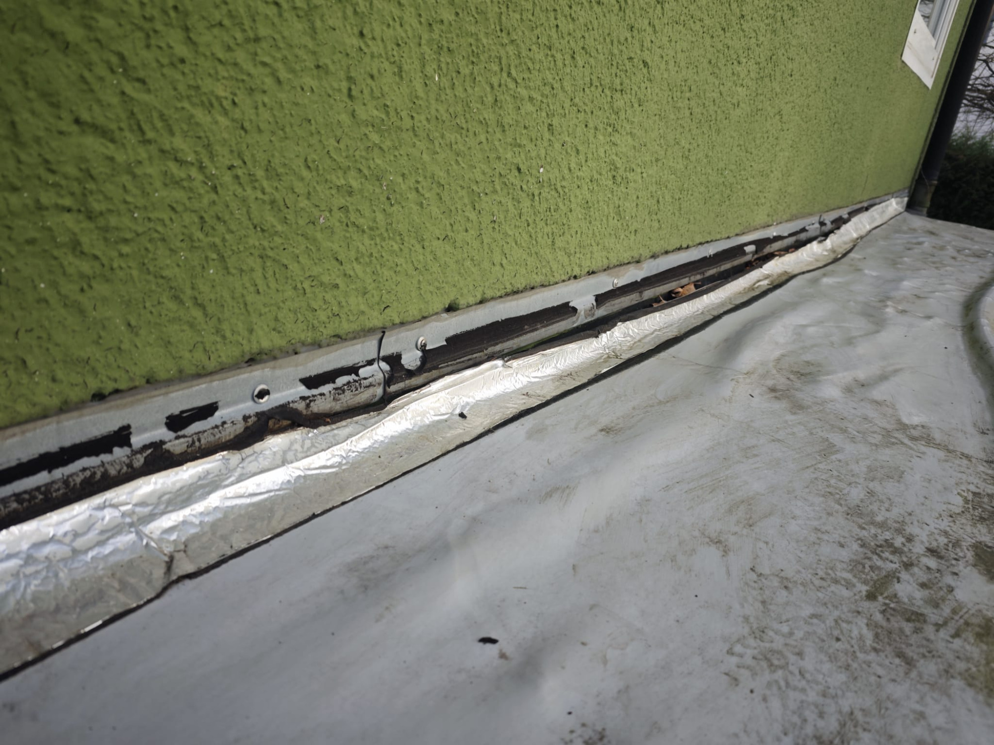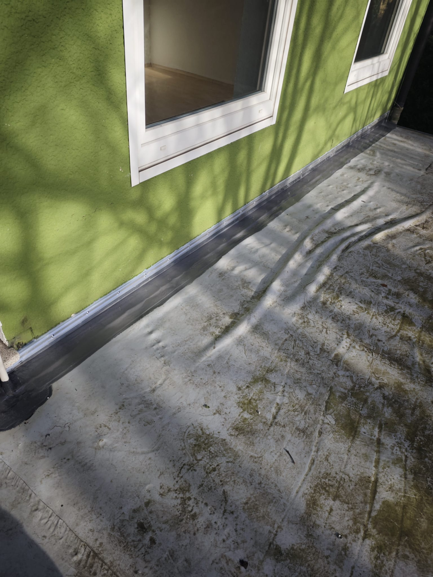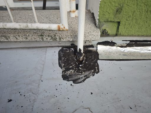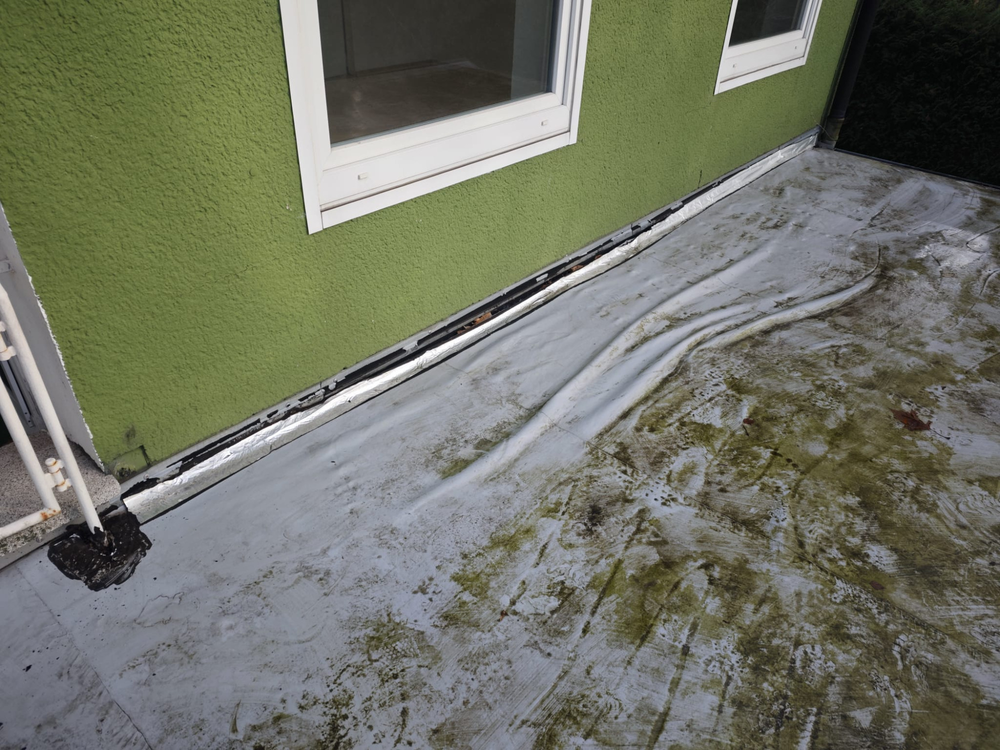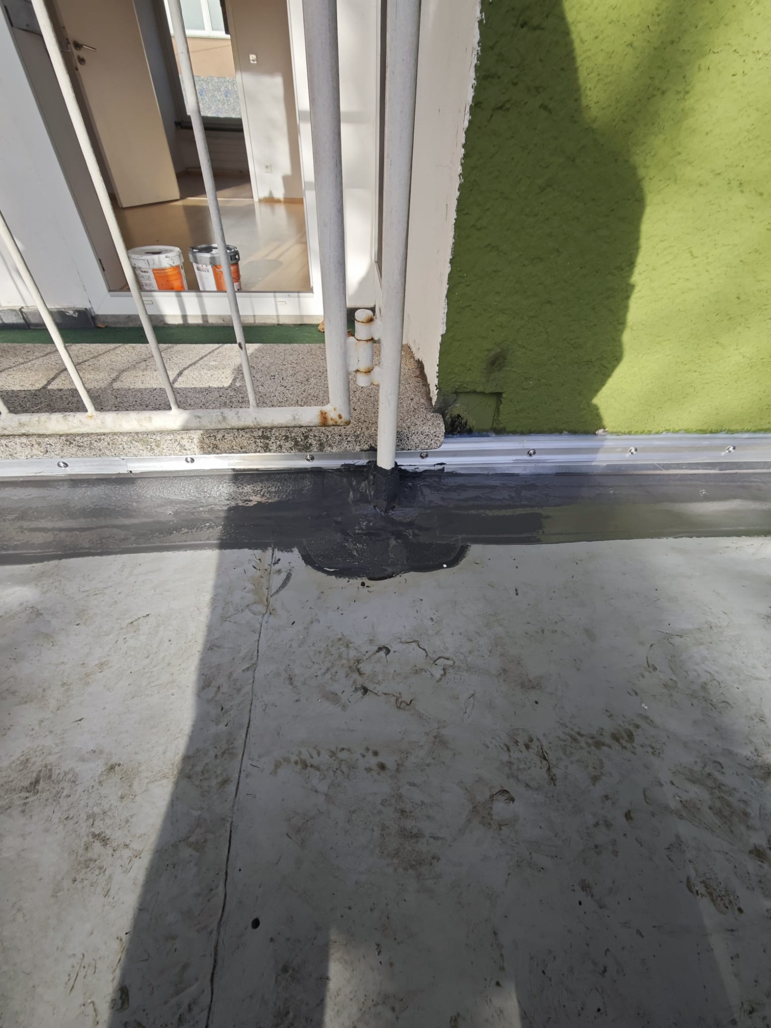 Undichter Wandanschluss und Geländerfüße. Neu eingedichtet mit Flüssigkunststoff.