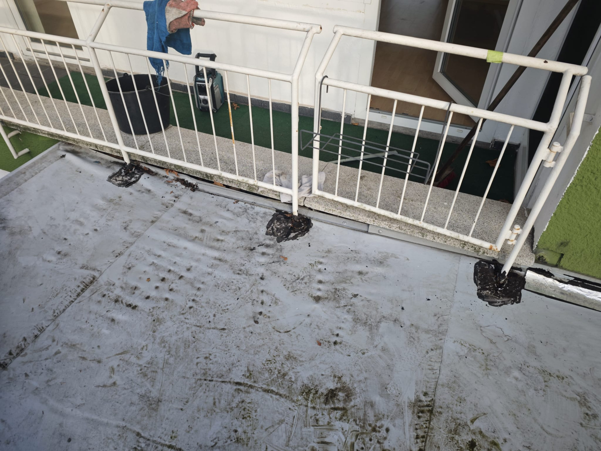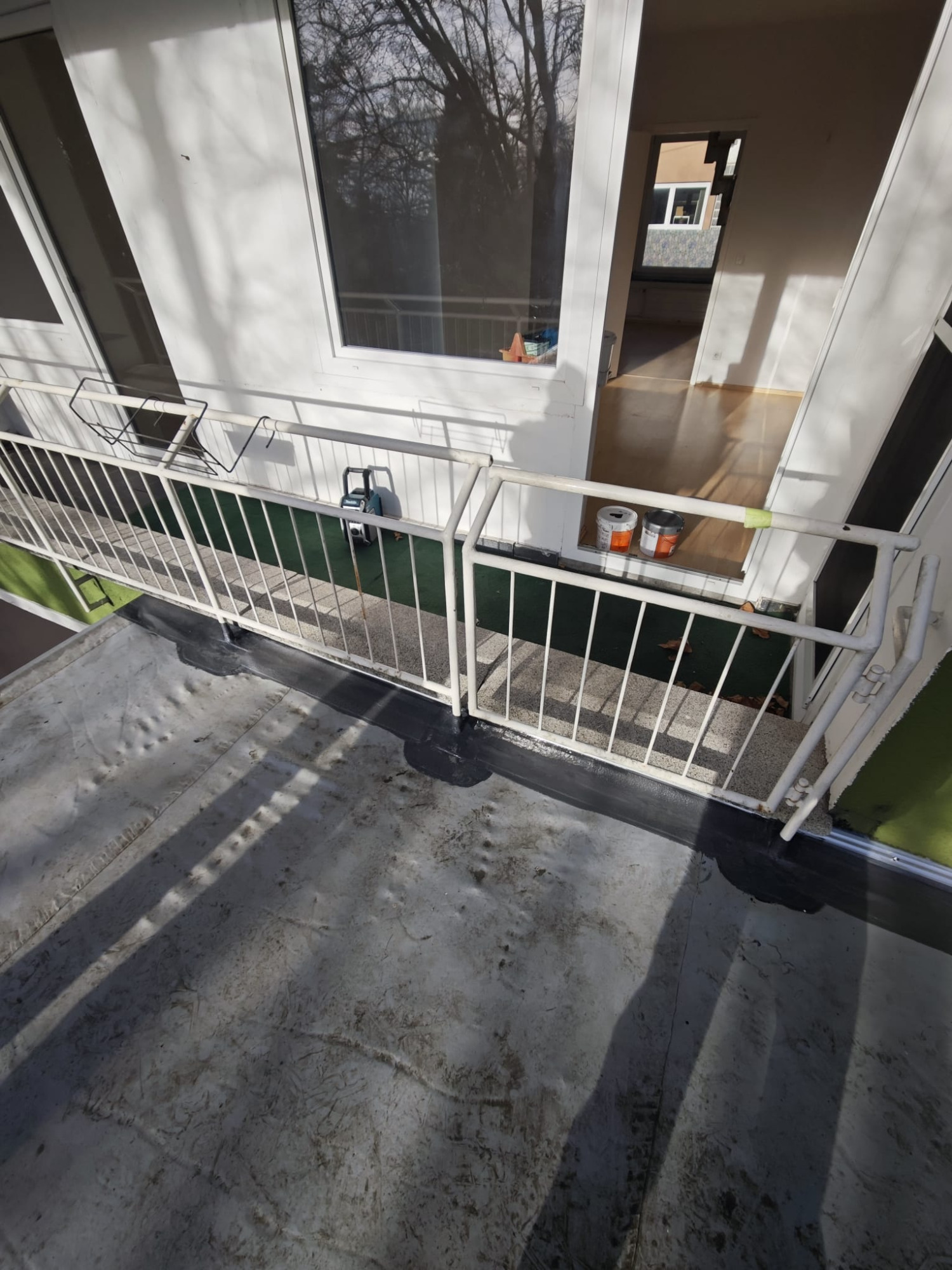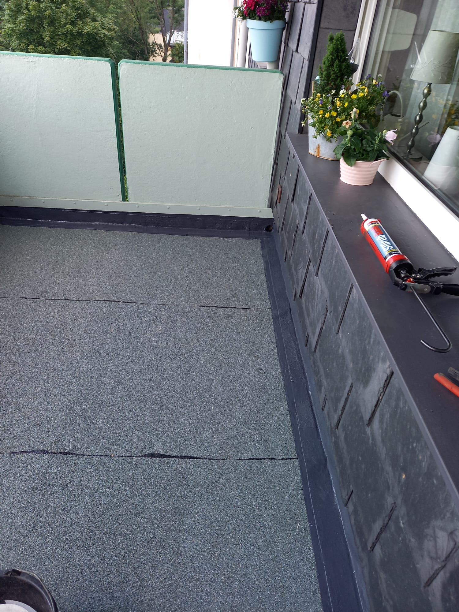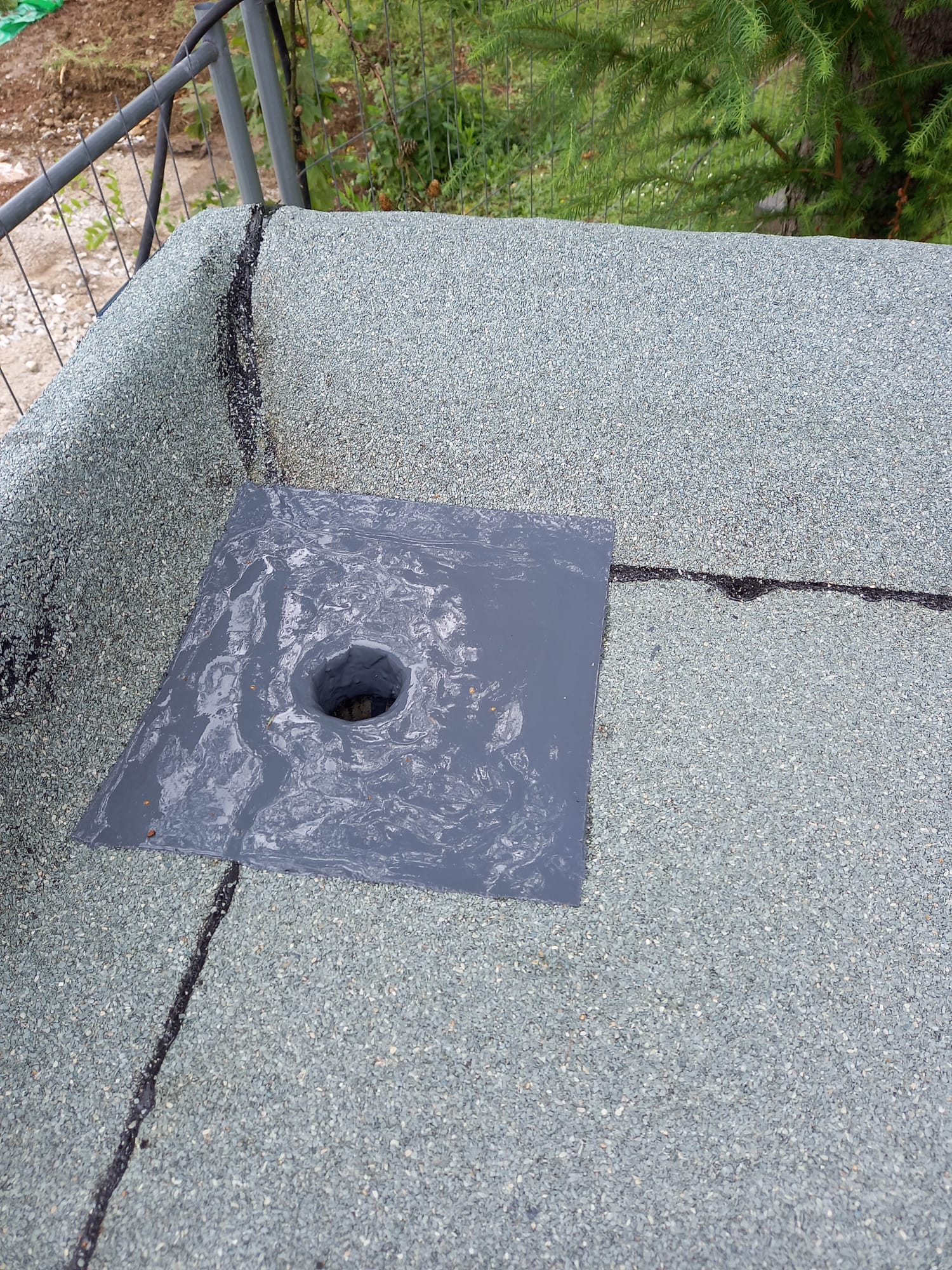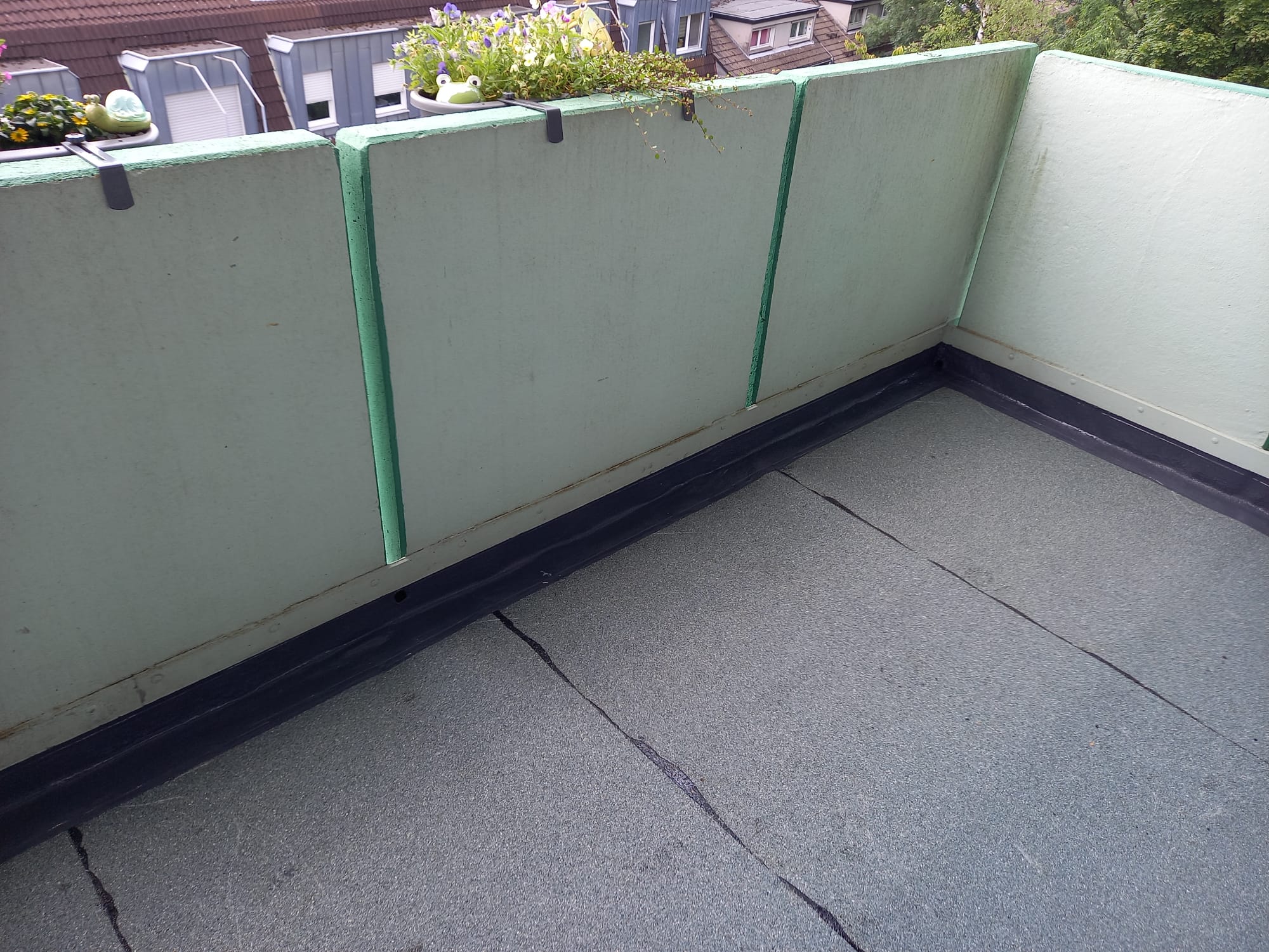 Undichter Wandanschluss und Geländerfüße. Neu eingedichtet mit Flüssigkunststoff.
